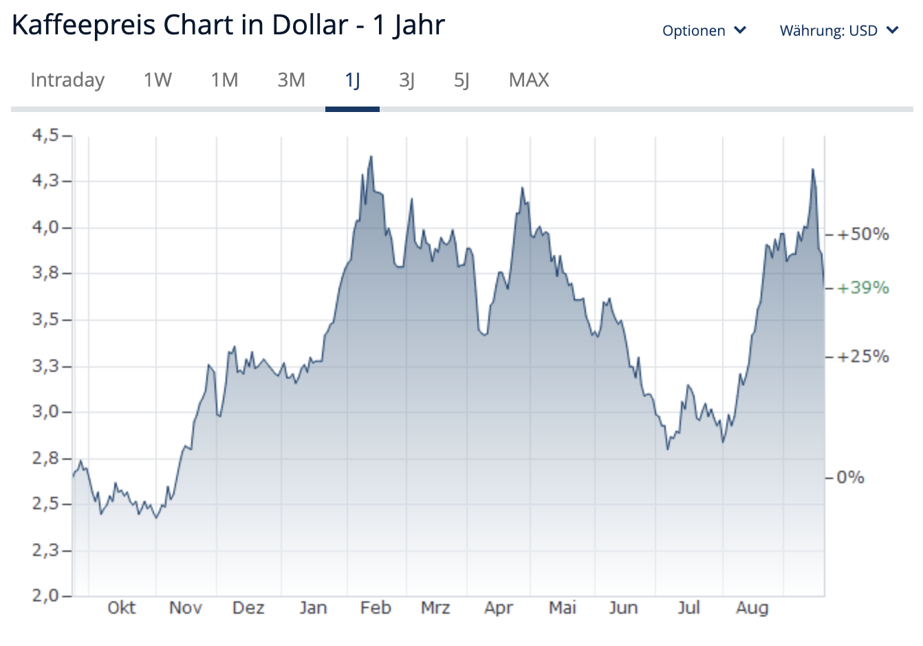• In allen Basisblends mit Robusta-Anteil liegen wir nun bei knapp 10 EUR netto für den Robusta – Preise, die vorher für hochwertigsten Arabica aufgerufen wurden.